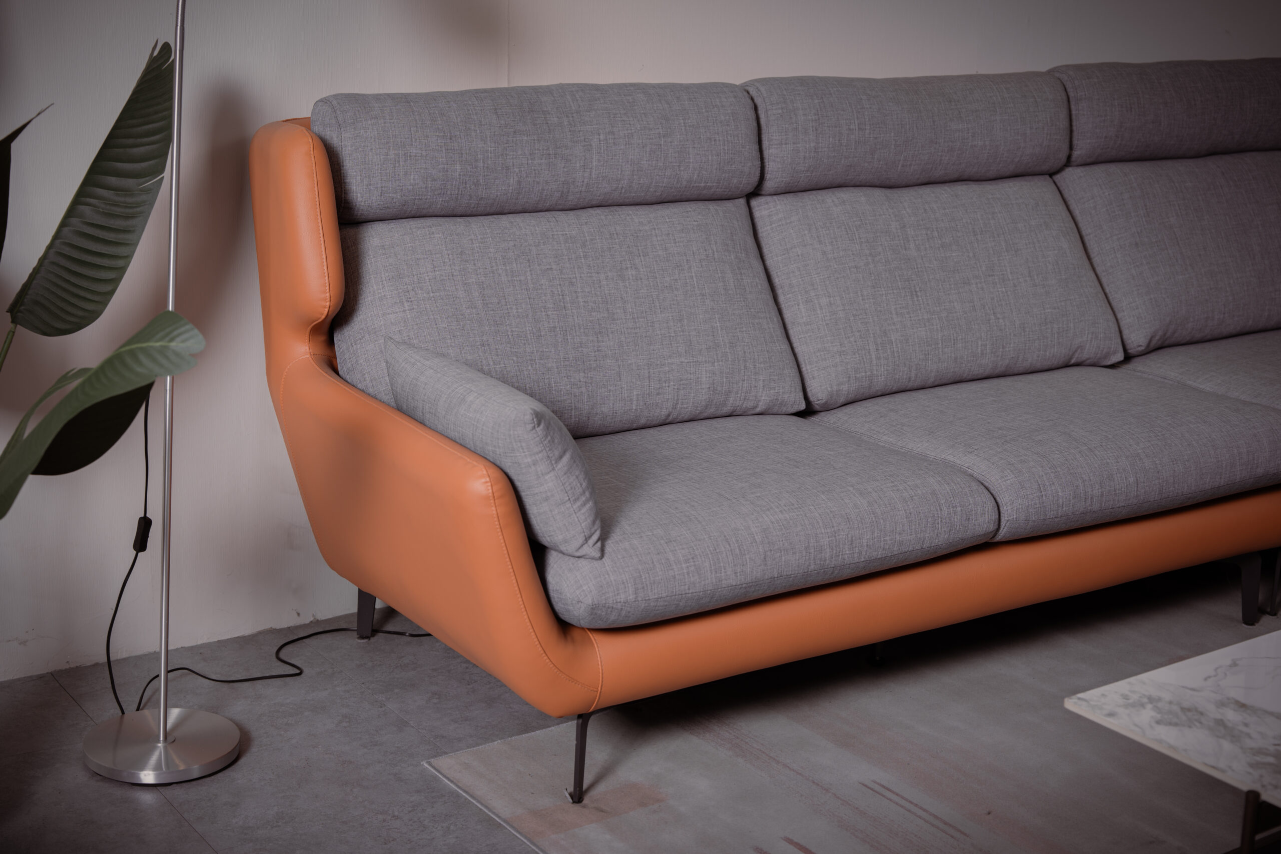 沙發外框採用柔韌的橘色軟 Q 皮,視覺層次立體鮮明,營造出現代家居中的一抹大膽亮點。